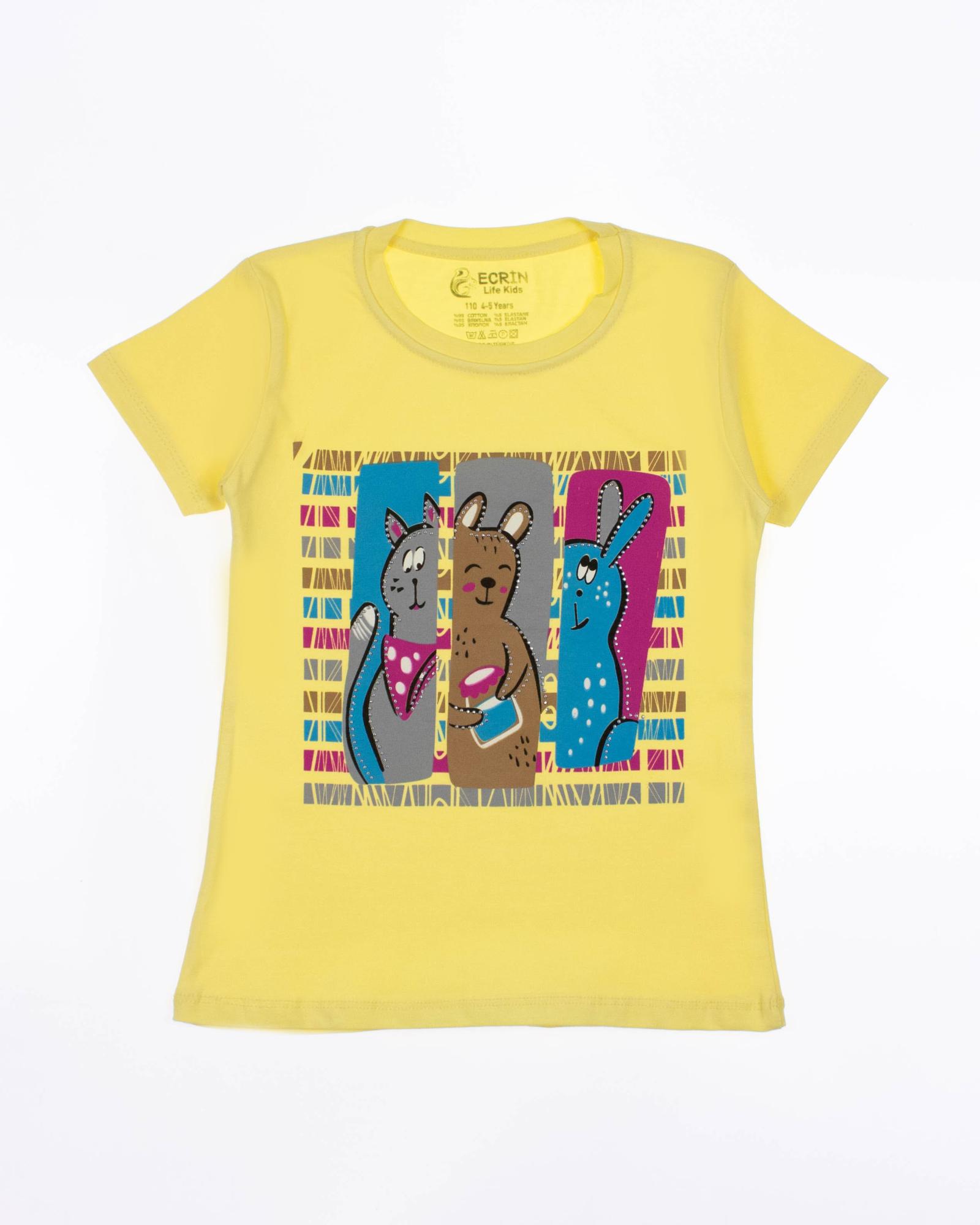 Футболка ECRIN для девочки оптом, производства Турция. Модель приталенного кроя из мягкого и эластичного трикотажа,  принт украшен стразами.