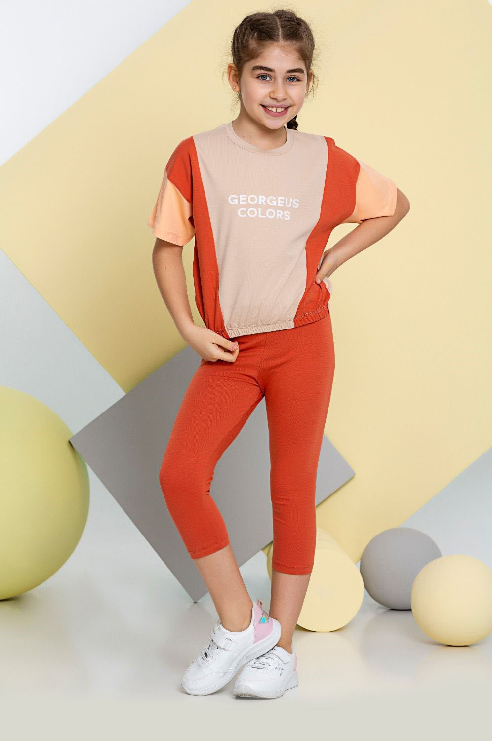 Костюм отлично сидит на фигурах разных типов. Укороченная футболка со спущенным рукавом на резинке и бриджи делают летний комплект оригинальным и стильным. Костюм выполнен из мягкого трикотажа кулирка.