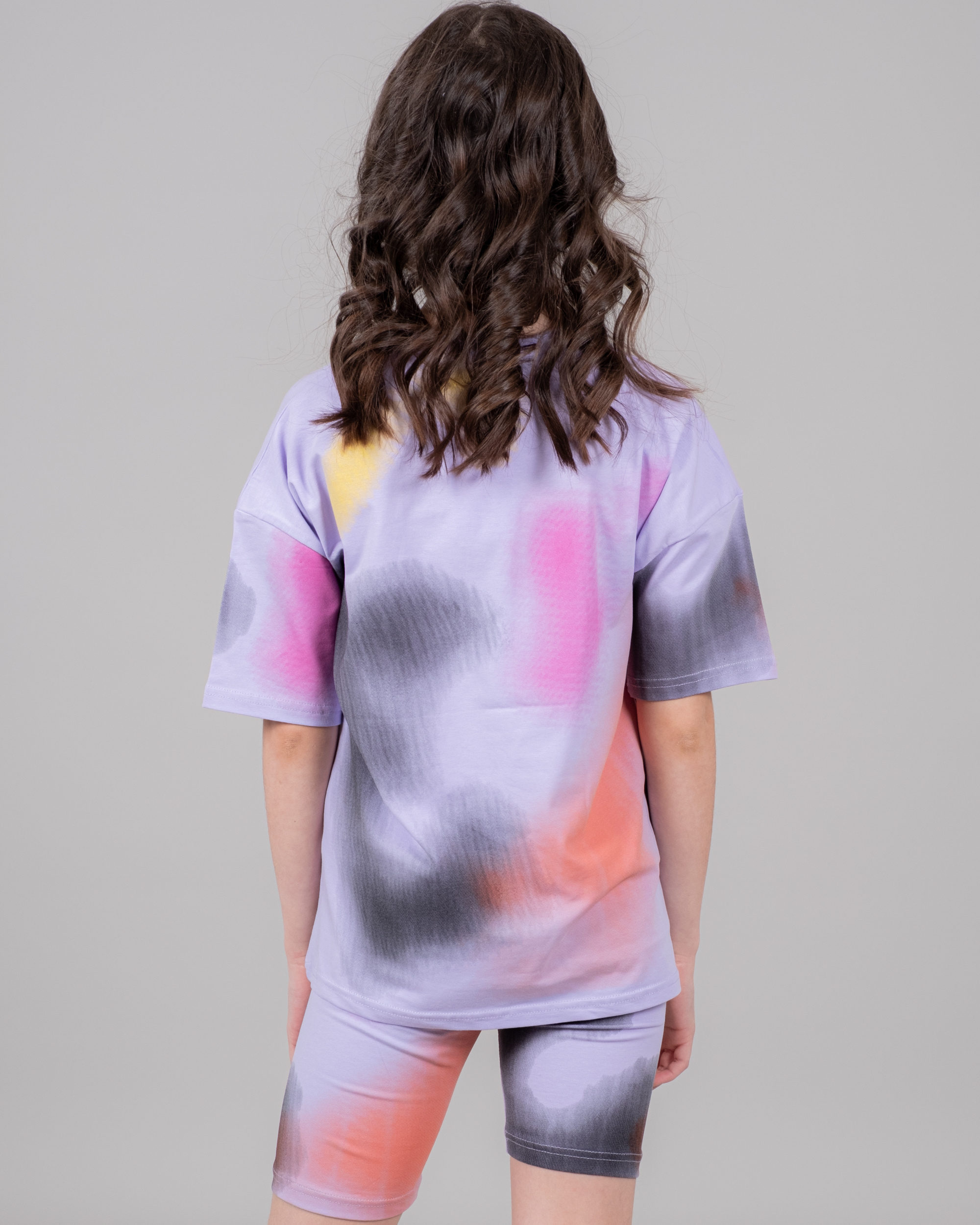 Модель включает в себя футболку свободного силуэта со спущенным плечом и велосипедки.