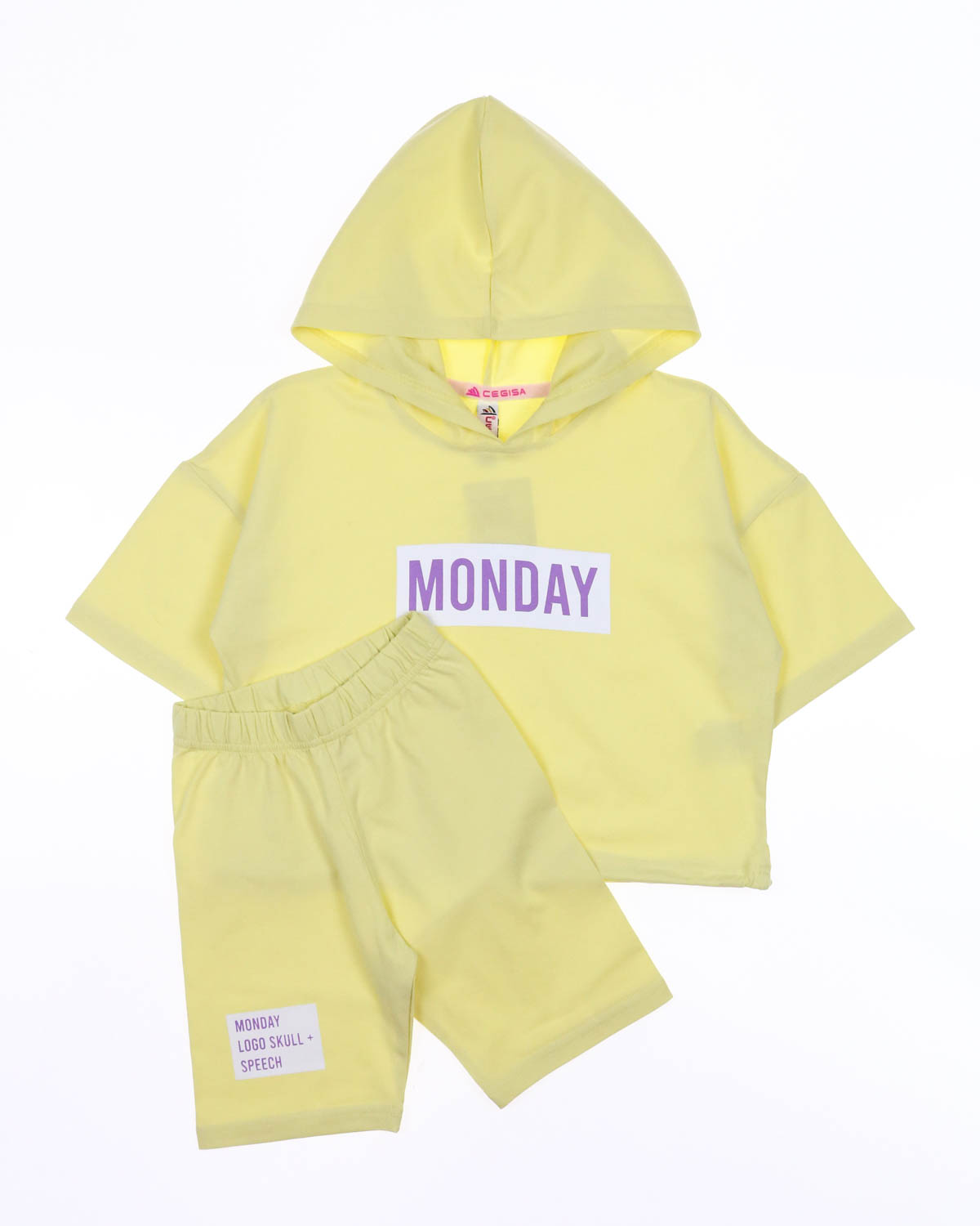 Летний костюм для девочек с принтом MONDAY. Кофта со спущенными короткими рукавами, дополненая капюшоном, низ на шнурке и трендовые велосипедки. Изготовлен из хлопка с добавлением лайкры.