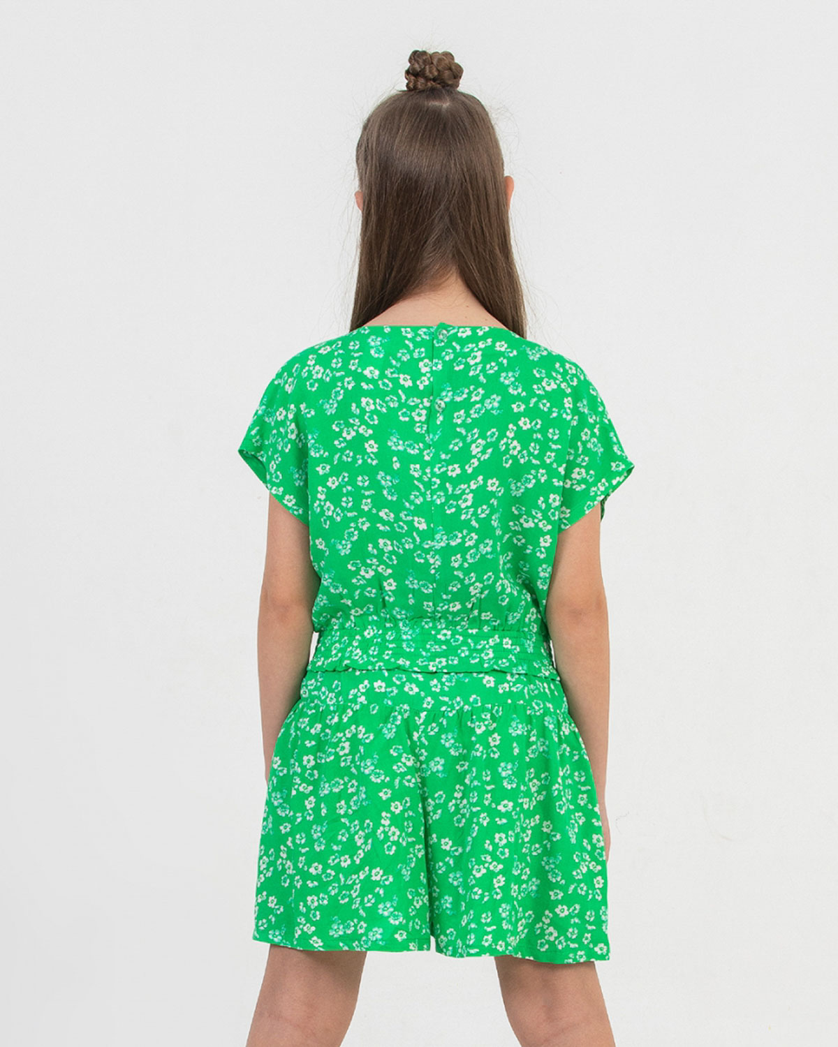 Костюм детский летний из штапеля с топом и шортами просто обязан быть в гардеробе каждой модницы. Юбка-шорты с комфортной посадкой и поясом на резинке. Топ свободного кроя на манжете, линия плеча спущенная, застегивается на пуговицы.
