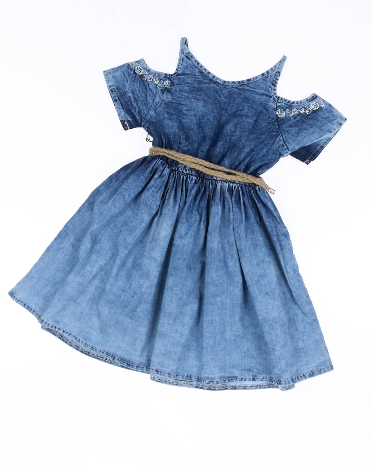 Нарядное платье из тонкой джинсы  понравится каждой девочке и станет ее любимым выбором на теплый летний день.  Горловина и плечи декорированы цветочной вышивкой и стразами. Талия подчеркнута эластичной резинкой. Пышная юбка с боковыми карманами.