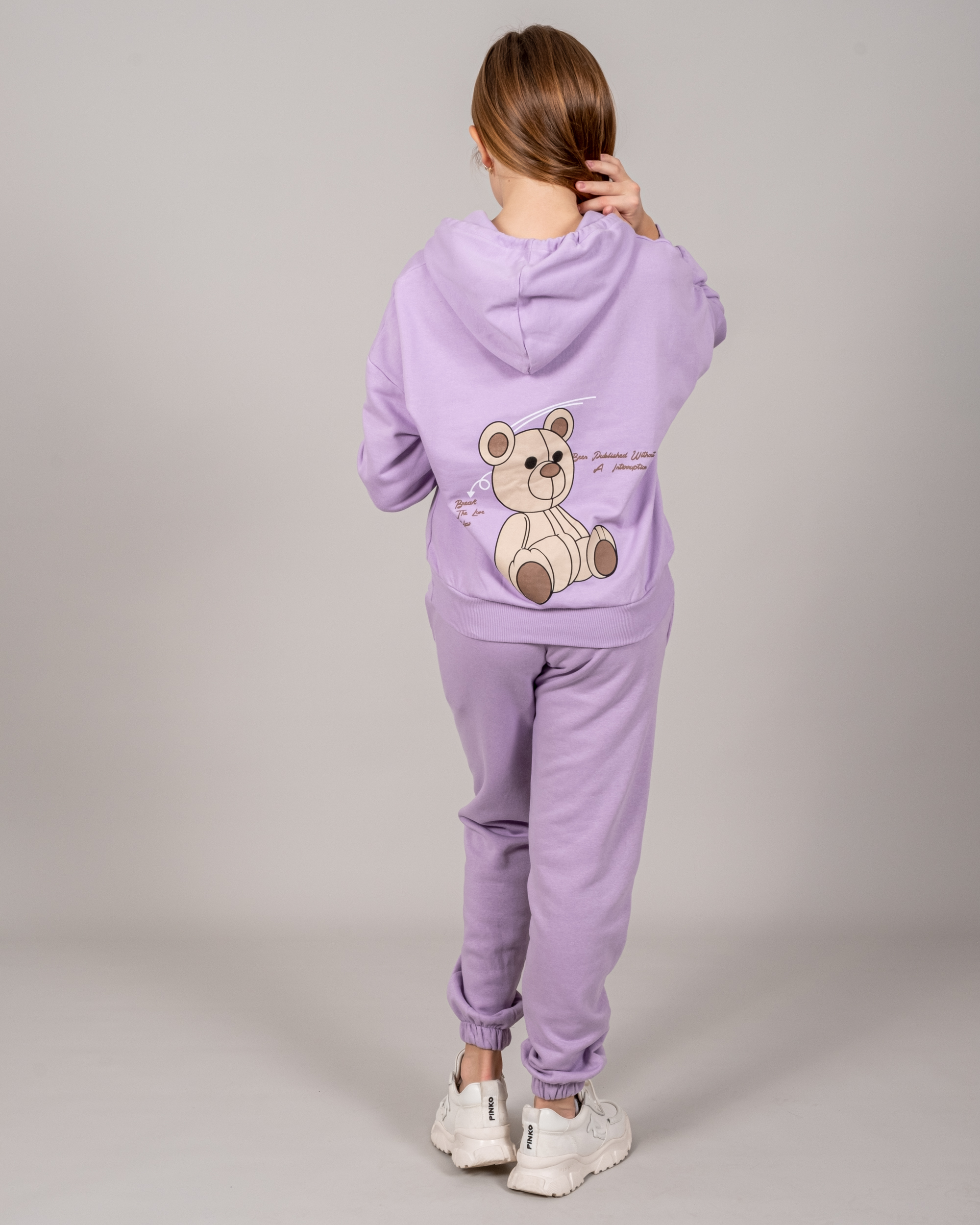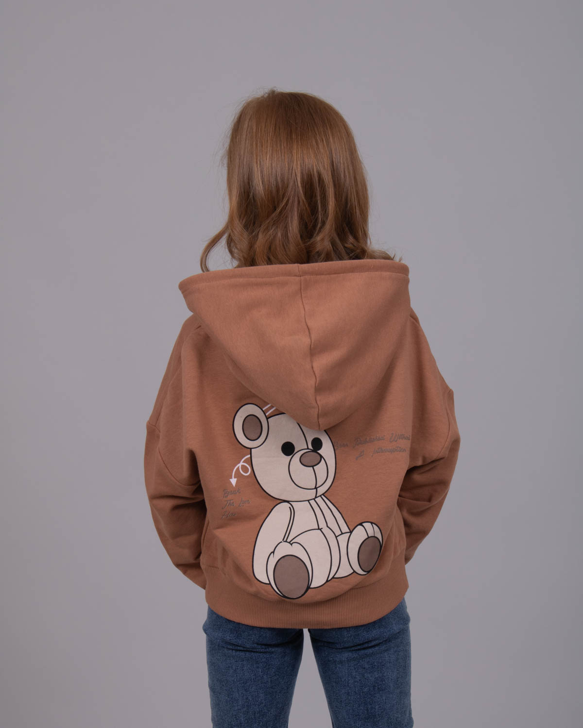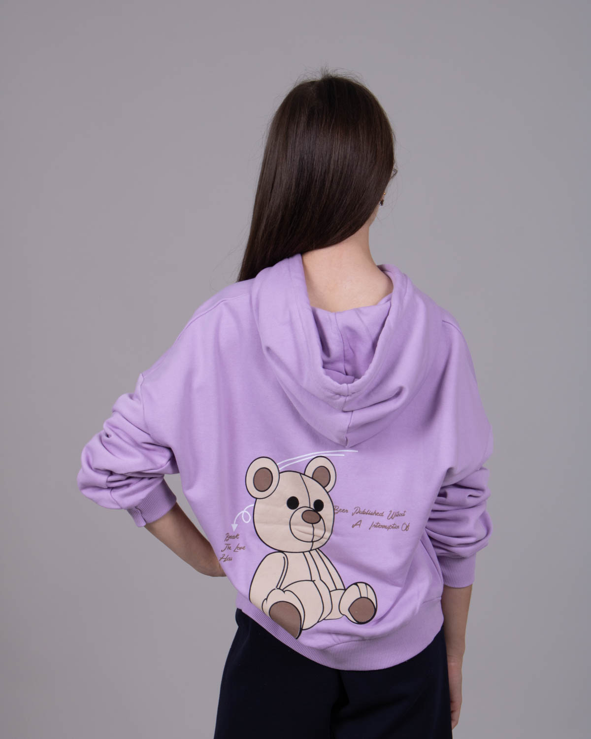 Худи для девочки выполнено из трикотажа - футер (петля). Модель дополнена аппликацией в виде игрушечного медведя.