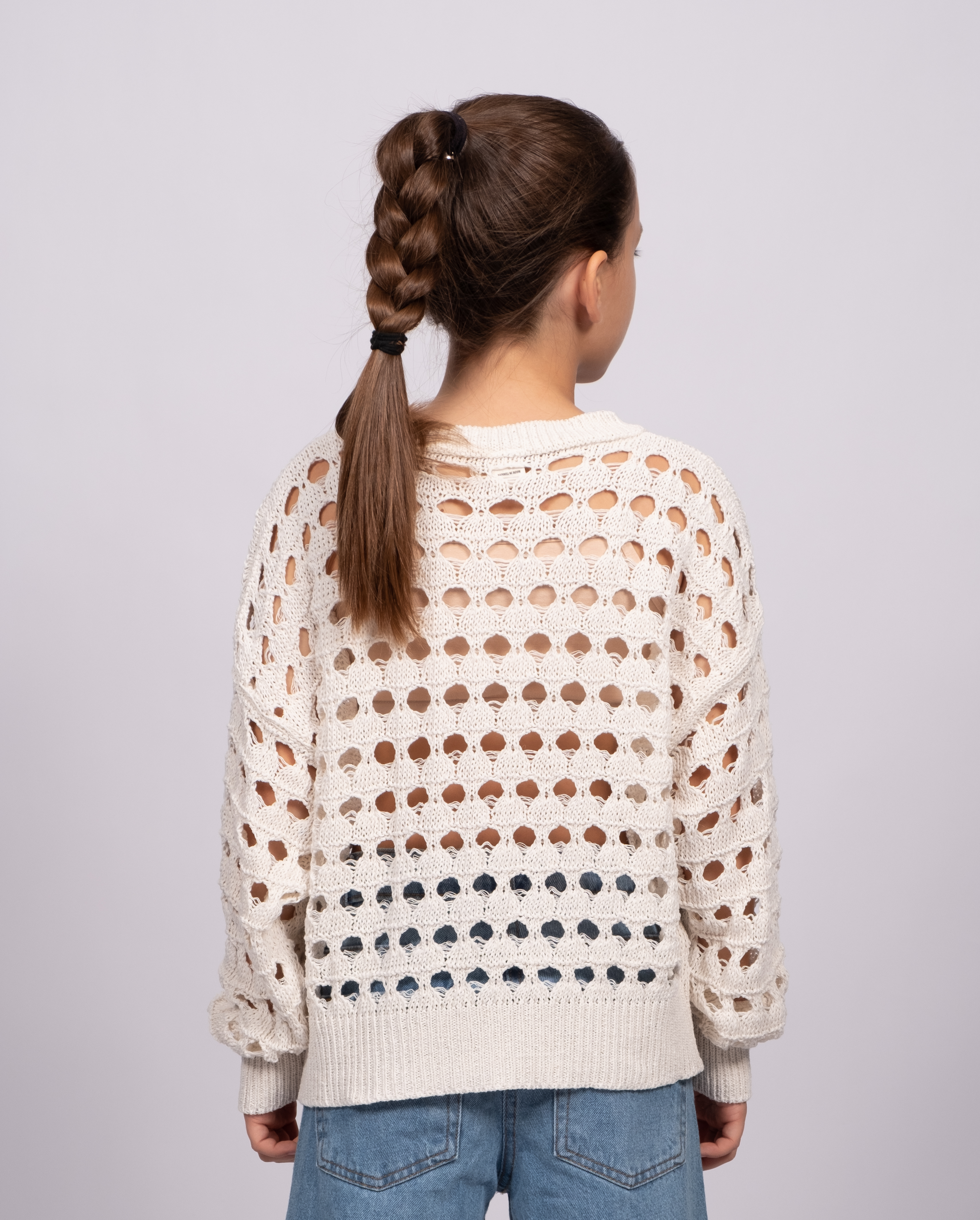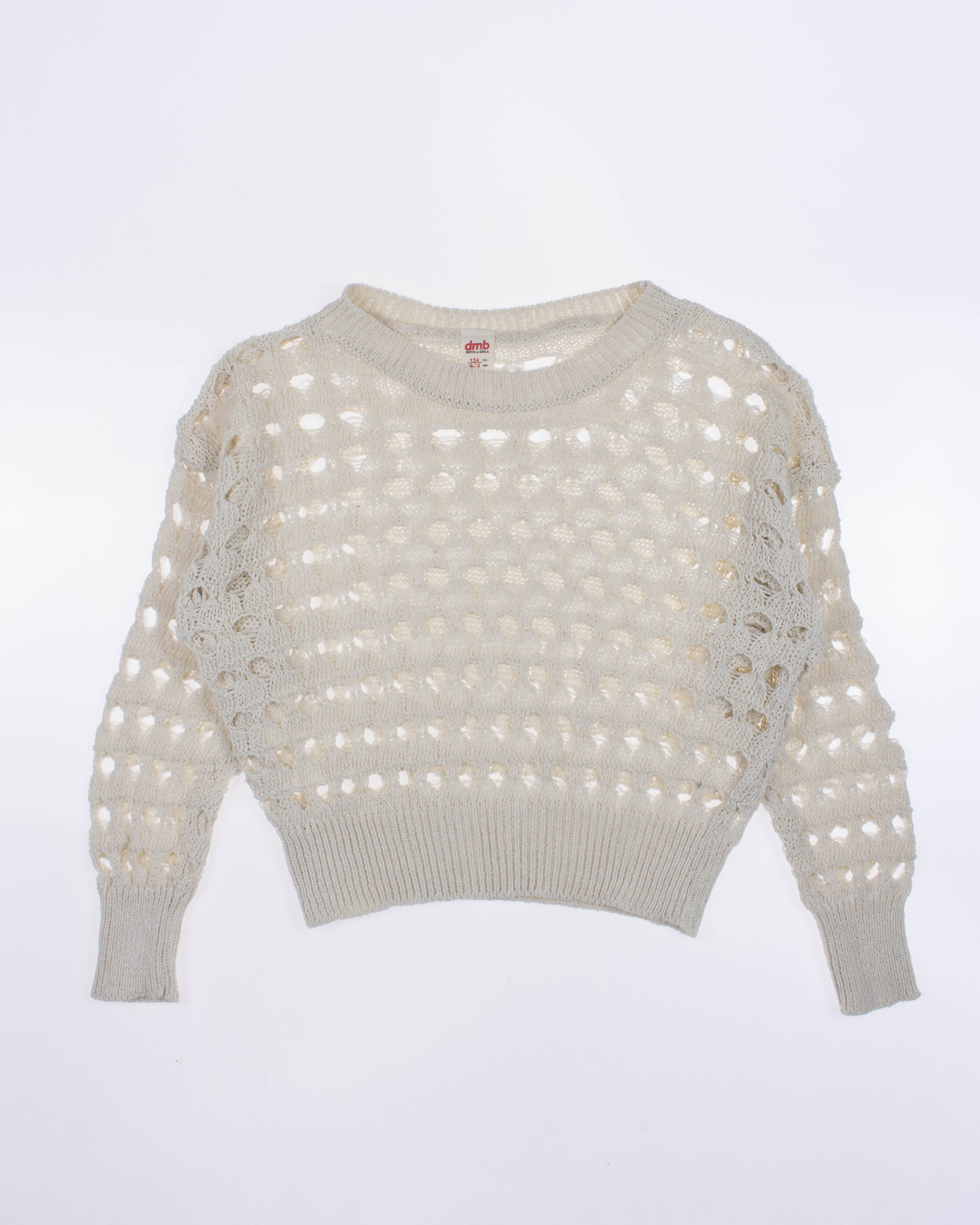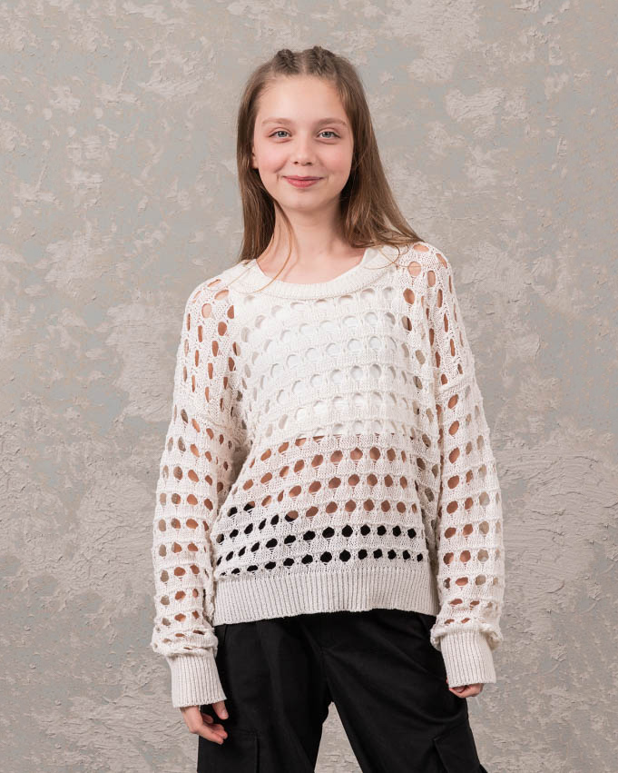 Джемпер DMB для девочек ажурной вязки оптом, выполнен из 100% хлопка. Свободный крой, круглый вырез горловины. Модель отлично сочетается с любой одеждой. Под низ можно надеть удлиненный или короткий топ в тон джемперу.