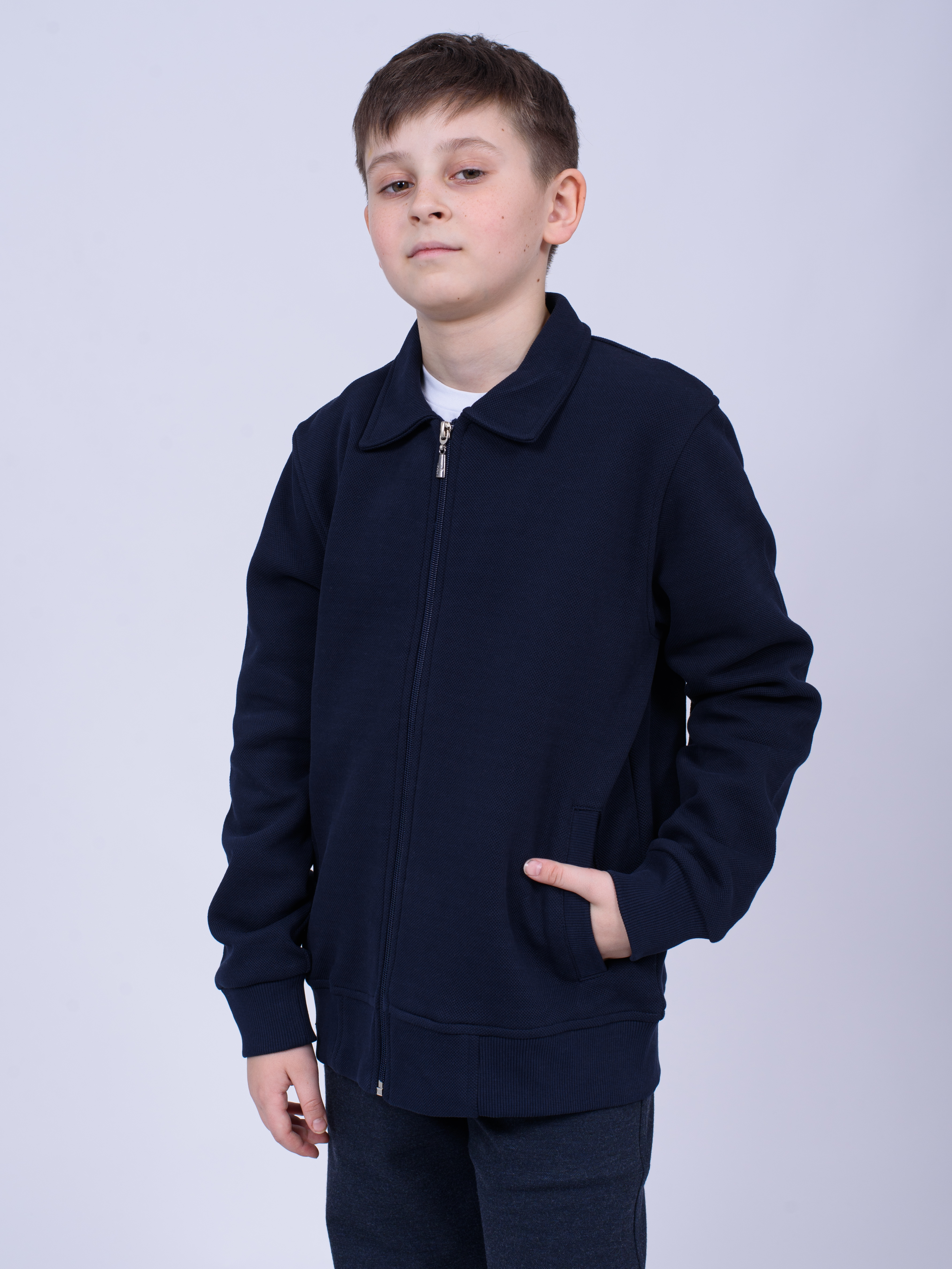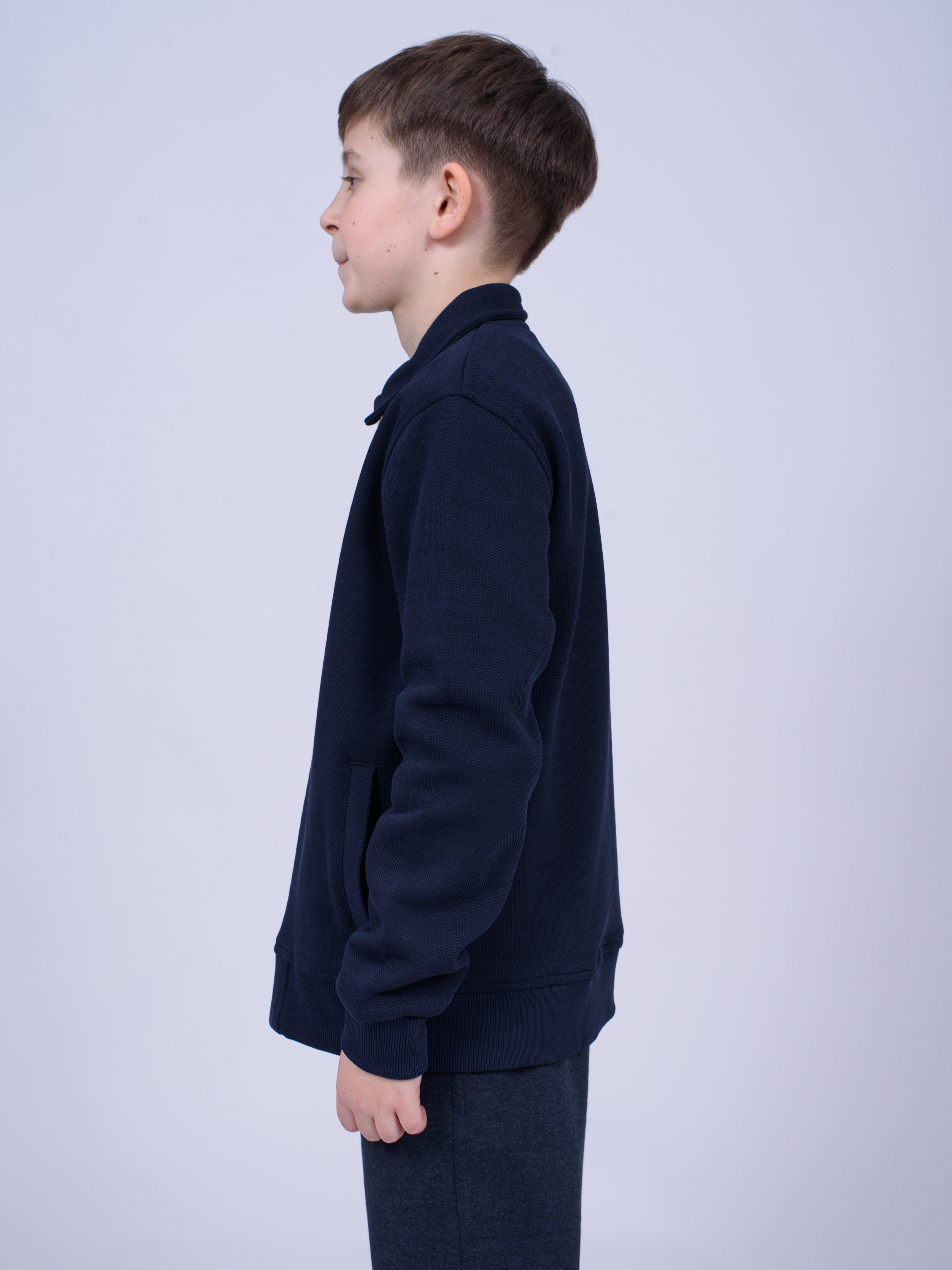 Трикотажный бомбер Cegisa для мальчика оптом. Выполнен из смесовой ткани, в составе которой натуральный хлопок с  добавлением полиэстера, трикотаж плотный. Воротник отложной. Низ изделия и рукава на трикотажном манжете. Вместительные карманы и разъемная застежка - молния. Хорошо сохраняет цвет и форму при длительной носке и после многократных стирок. Прекрасно будет смотреться как школьная форма.