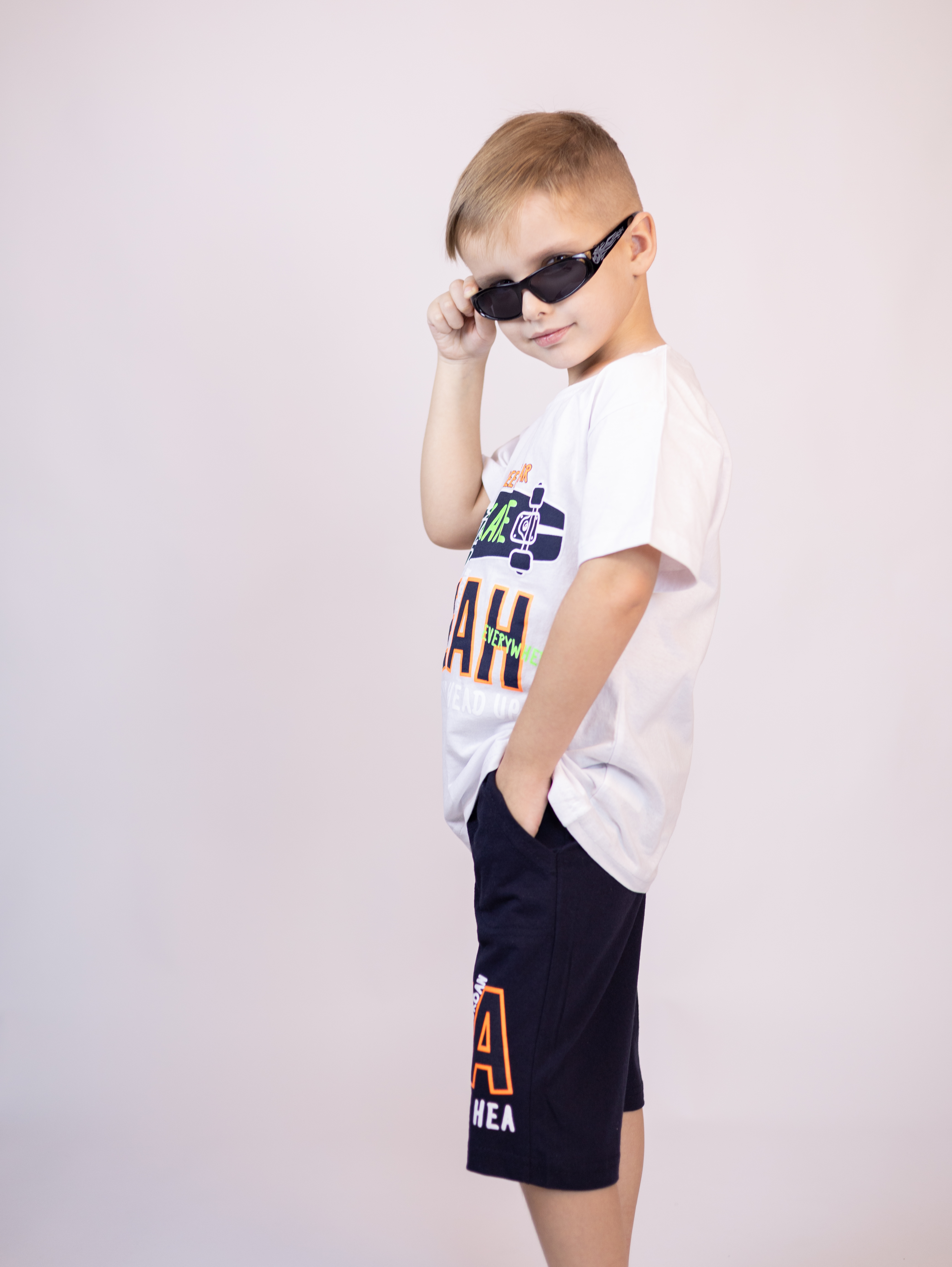 Трикожный костюм BOLD оптом из 100% хлопка с оригинальным, ярким принтом. Шорты трикотажные с карманами.