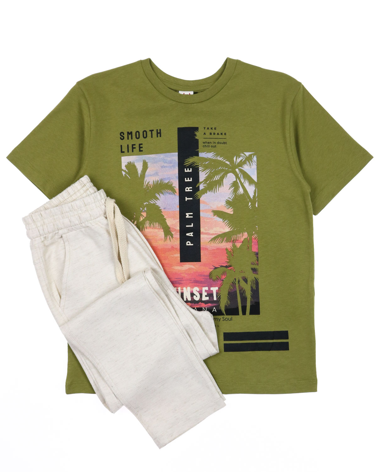 Летний костюм DMB для мальчика оптом. Футболка прямого кроя с короткими рукавами. Брюки легкие из хлопка без эластана с боковыми карманами. Пояс на резинке с функциональным шнурком позволяет ругулировать посадку на талии, штанины зауженные без манжетов.