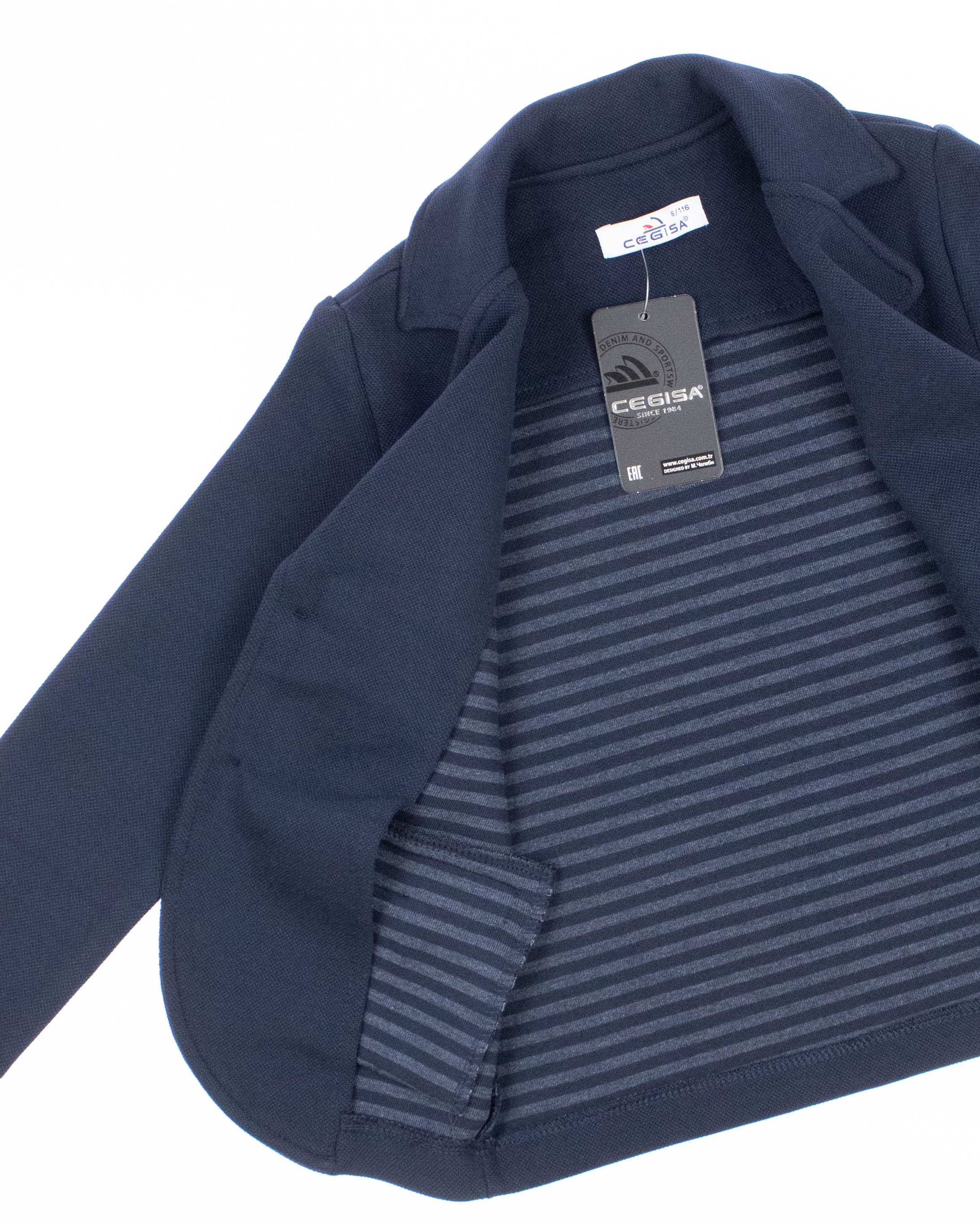 Трикотажный пиджак Cegisa для мальчика оптом. Выполнен из хлопковой ткани. Отложной воротник .  Вместительные карманы и разъемная застежка - пуговицы. Хорошо сохраняет цвет и форму при длительной носке и после многократных стирок. Прекрасно будет смотреться как школьная форма.