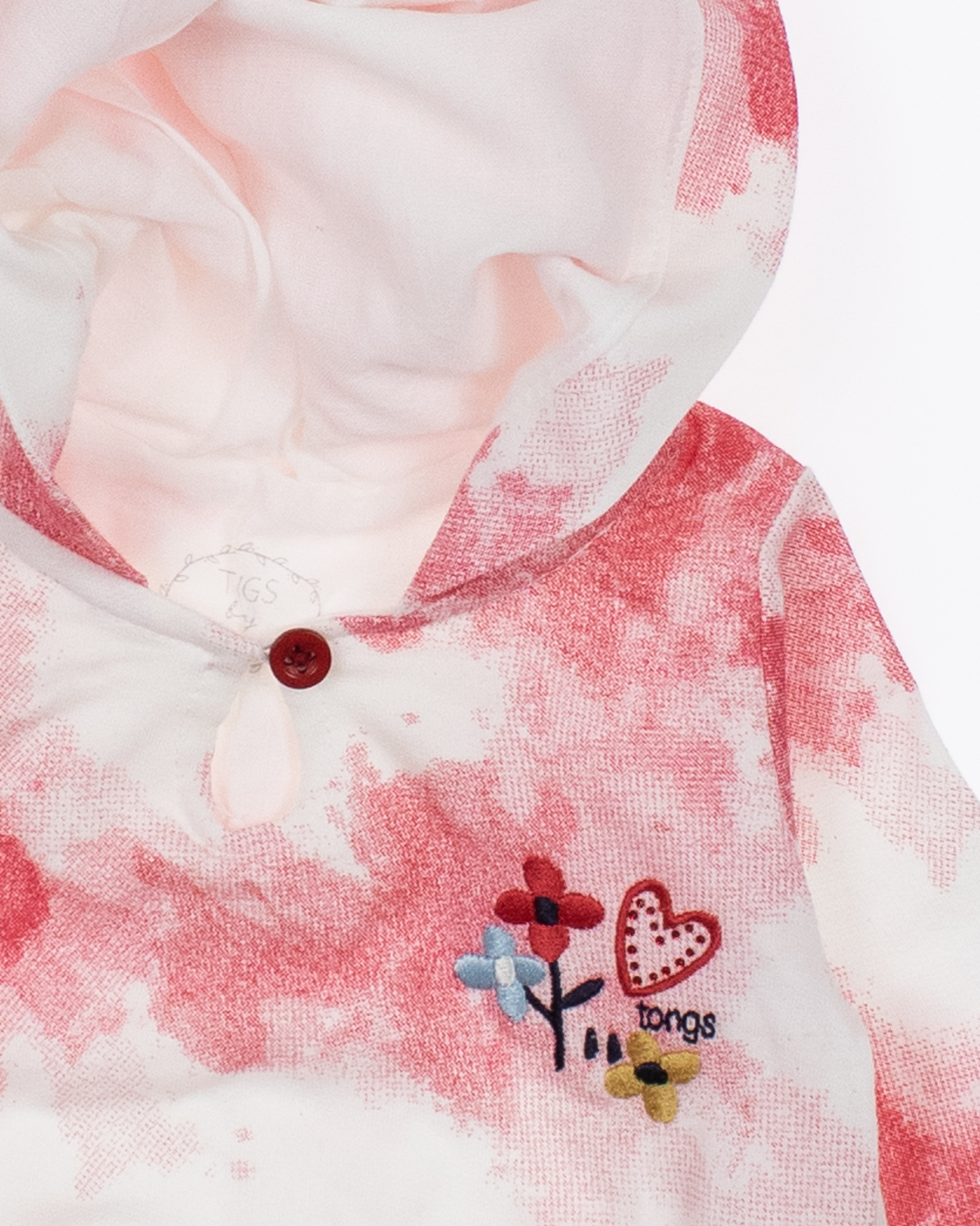 Наше компания предлагает ясельные костюмы TONGS BABY оптом, которые производятся в Турции. Костюм изготовлен из 100% натурального хлопка и имеет уникальную расцветку тай-дай. Кофточка имеет застежку на пуговицу спереди, а на груди украшена милой вышивкой. Капюшон в костюмах двойной, что обеспечивает дополнительную защиту от холода и ветра.