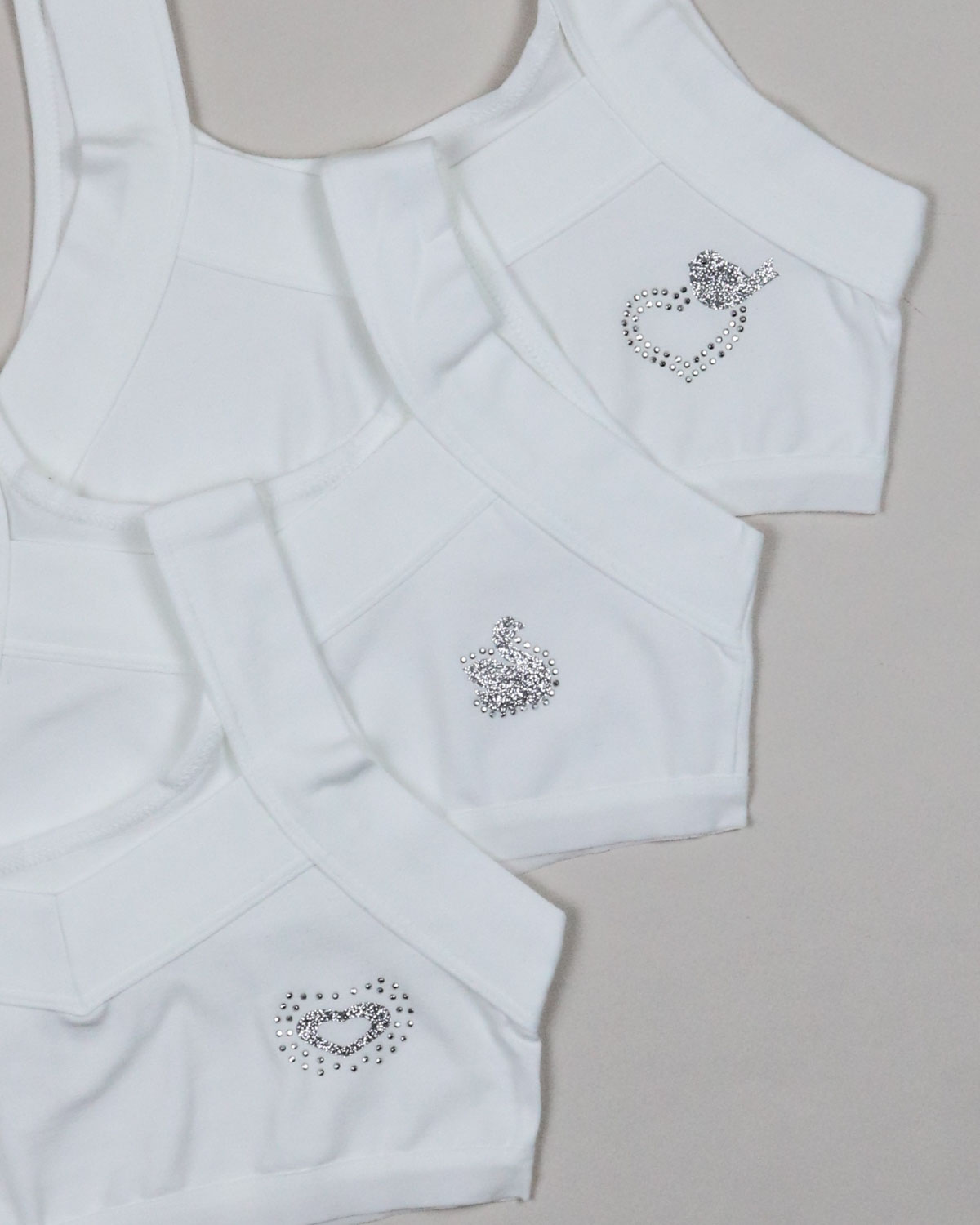 Бюстье для девочки изготовлено из кулирки гладкого, приятного к телу материала. Хорошо тянется благодаря добавлению эластана.   Бюстье для девочки очень комфортно для повседневной носки. Гипоаллергенная ткань приятно прилегает к телу, впитывая излишки влаги, пропуская воздух. Современная технология пошива обеспечивает изделиям высокие качественные характеристики и идеальный комфорт. Очаровательный дизайн и милый блестящий принт смотрятся невероятно нежно.