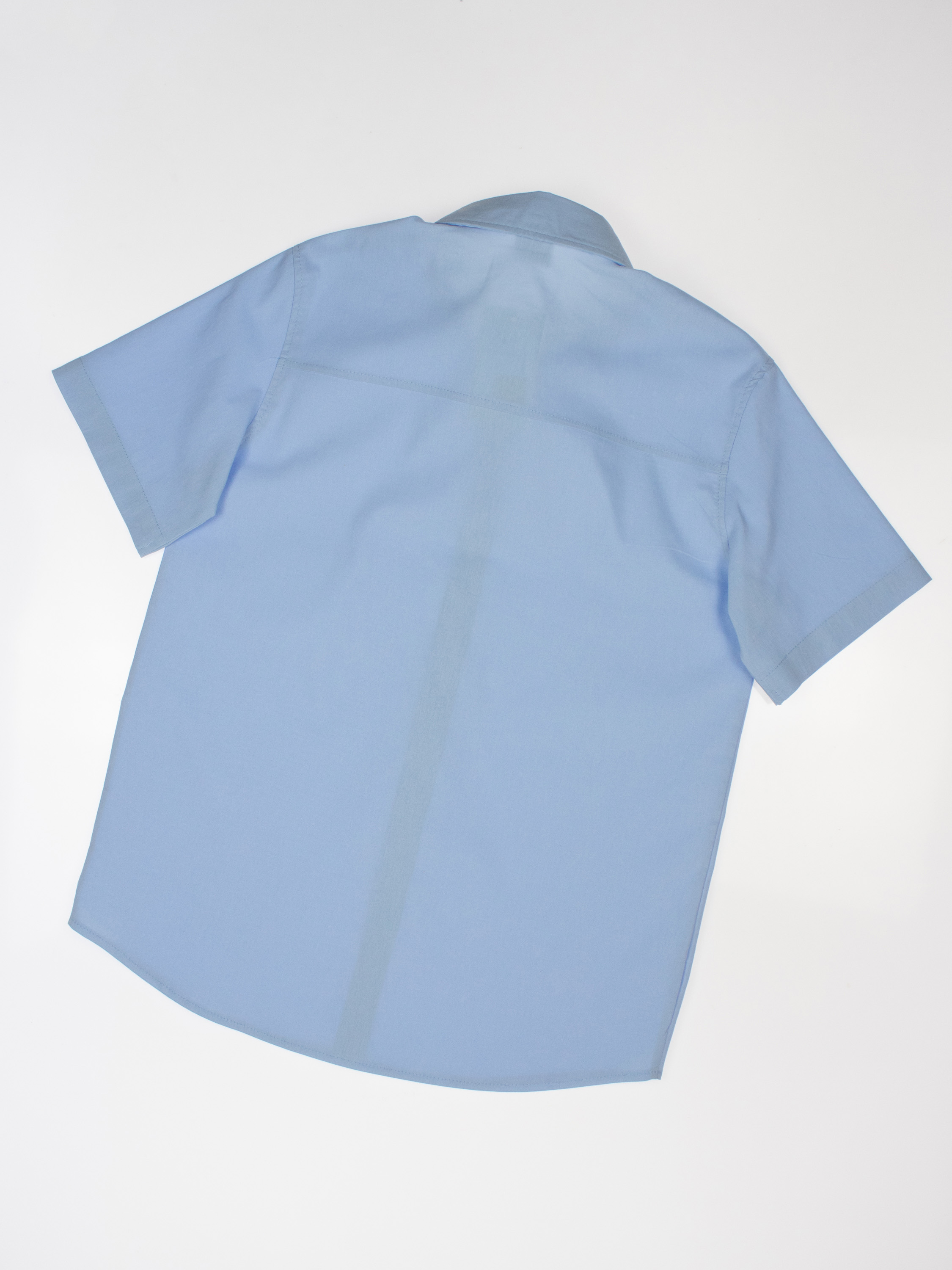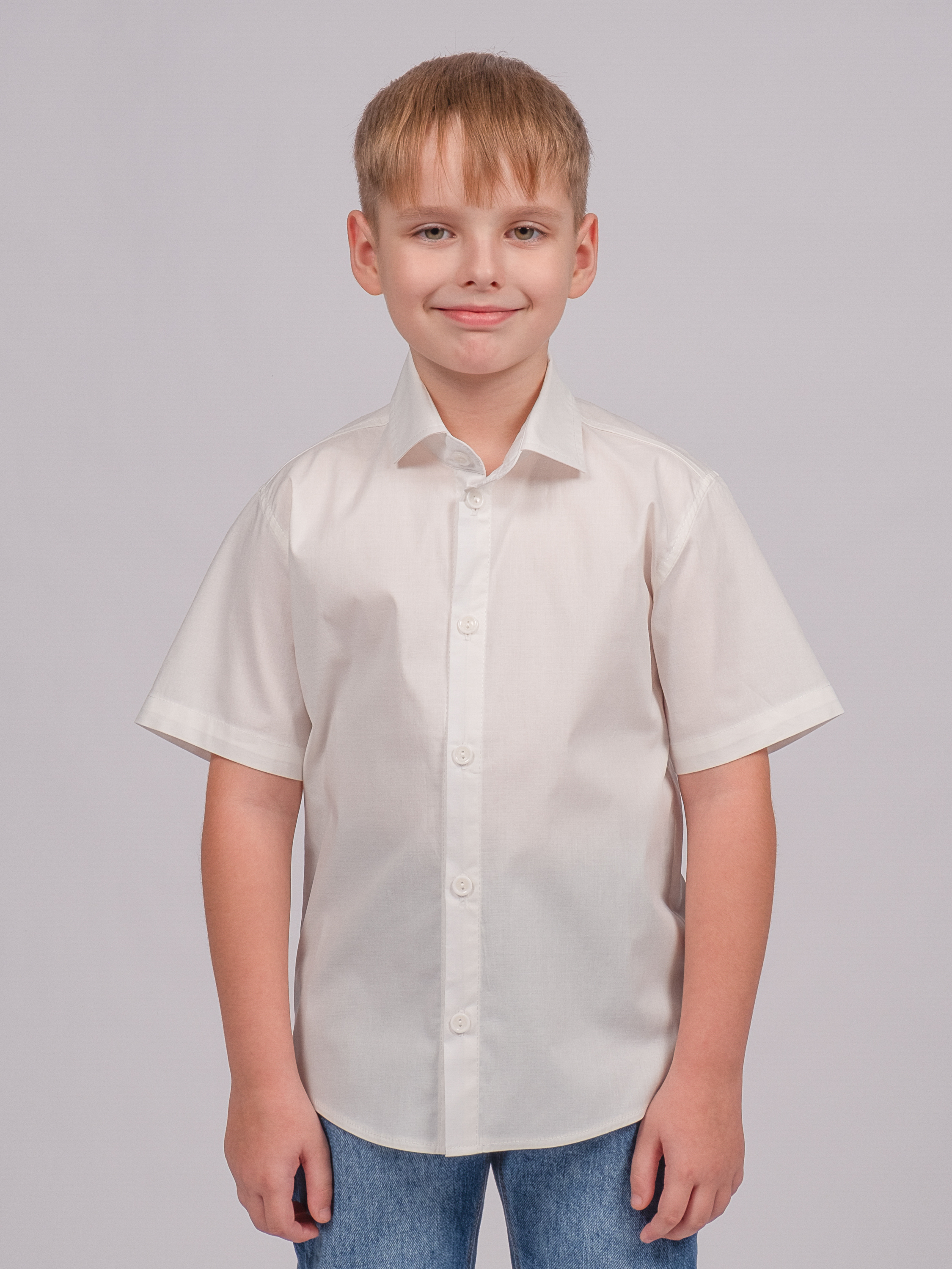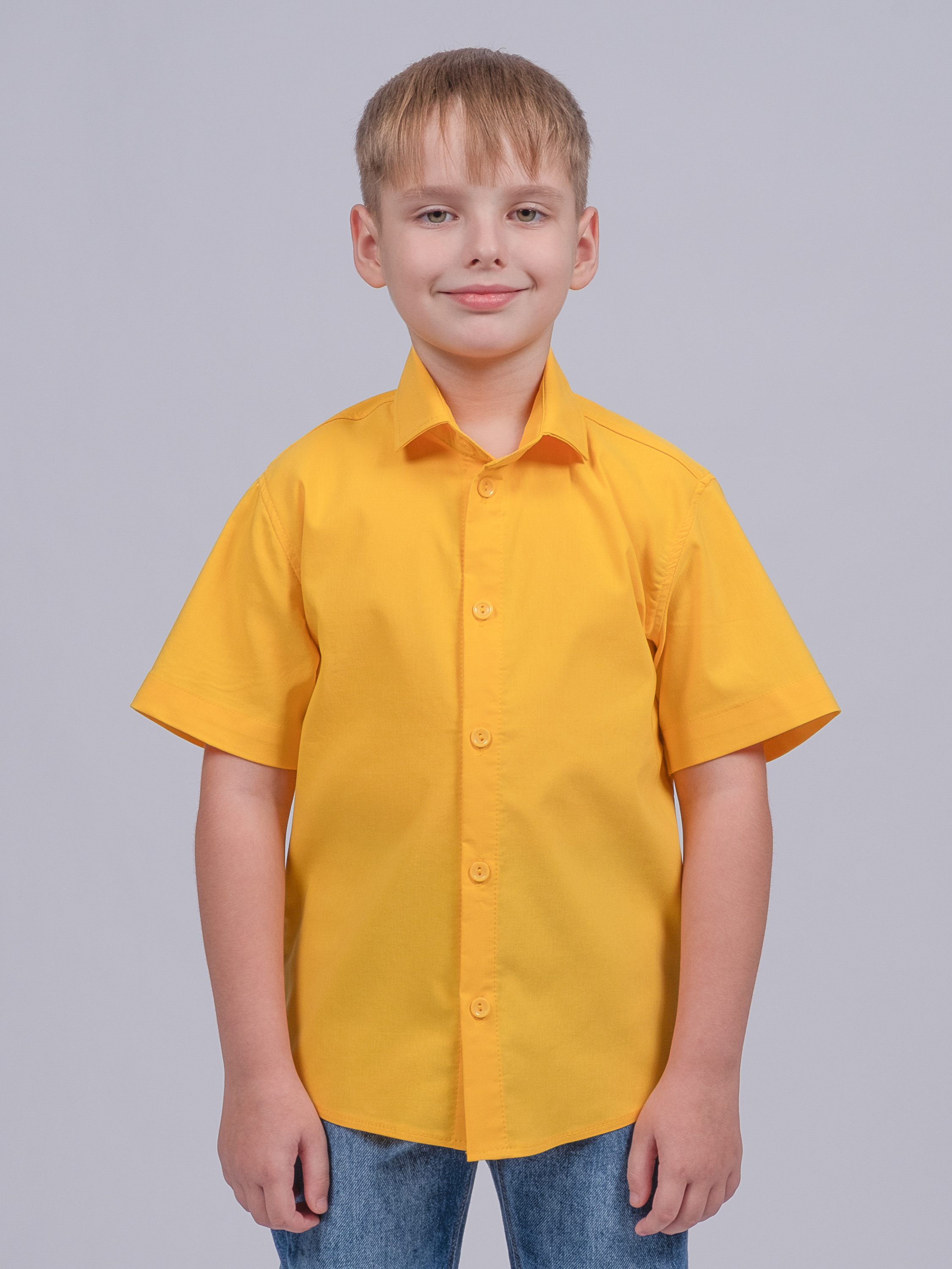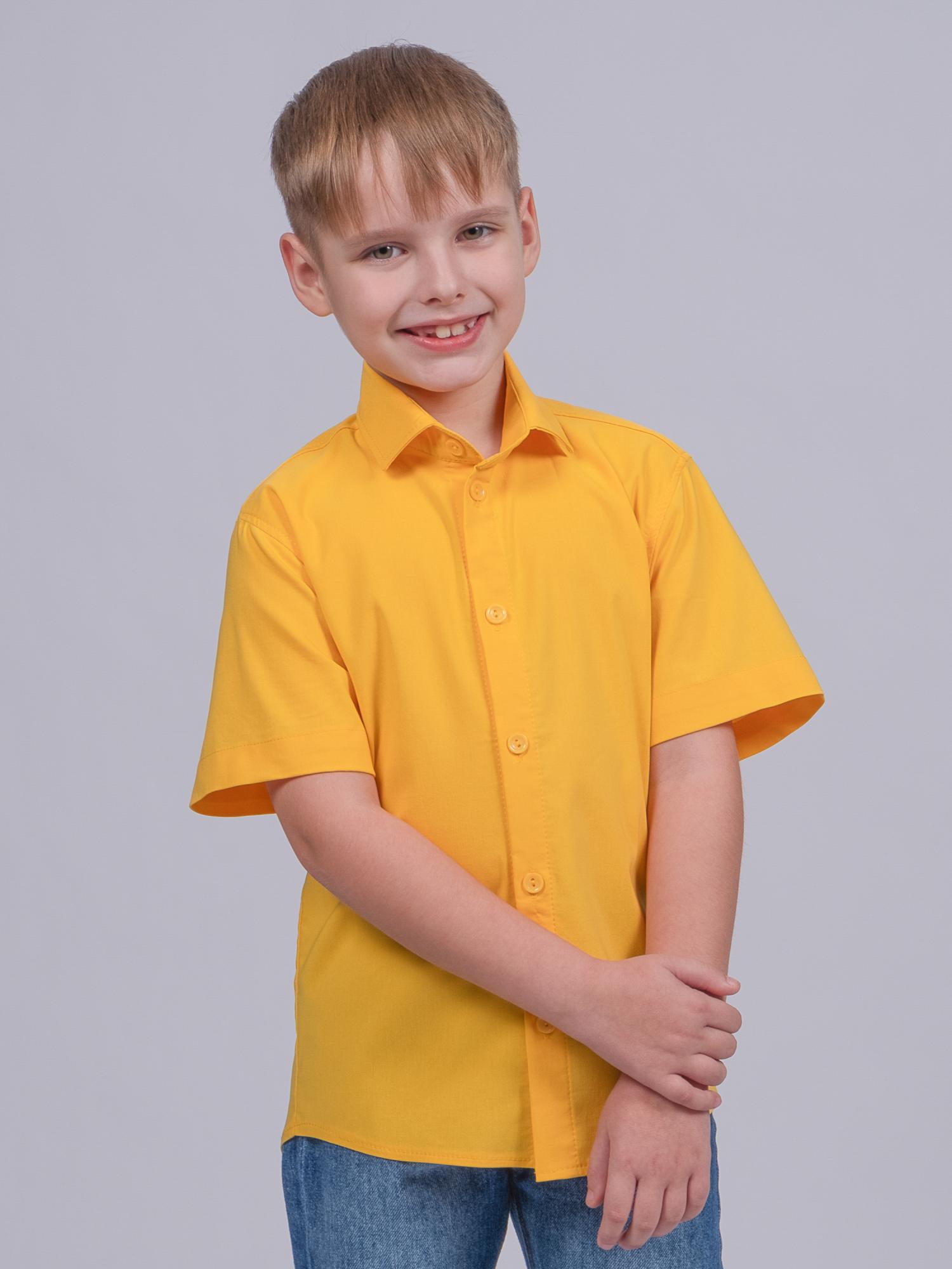 Детская однотонная рубашка с коротким рукавом для мальчика оптом. Рубашка изготавлена из смесового материала высокого качества. Модель застегивается на пуговицы.