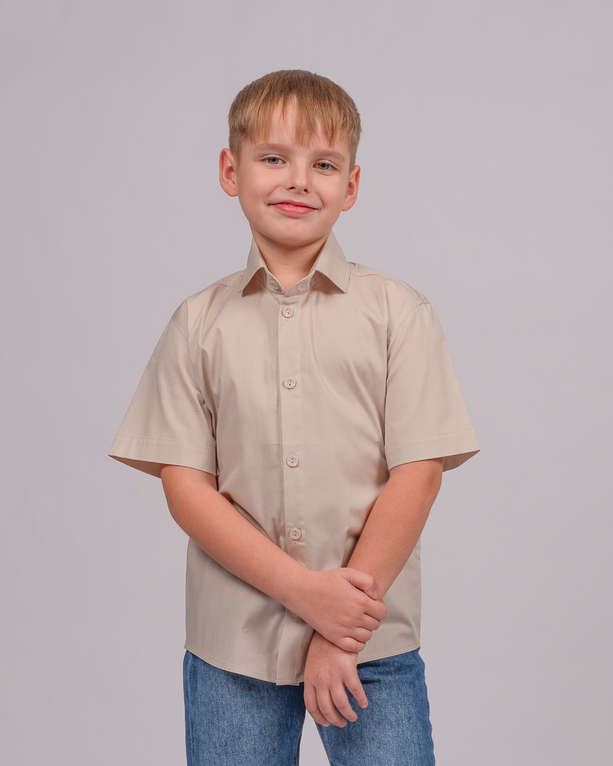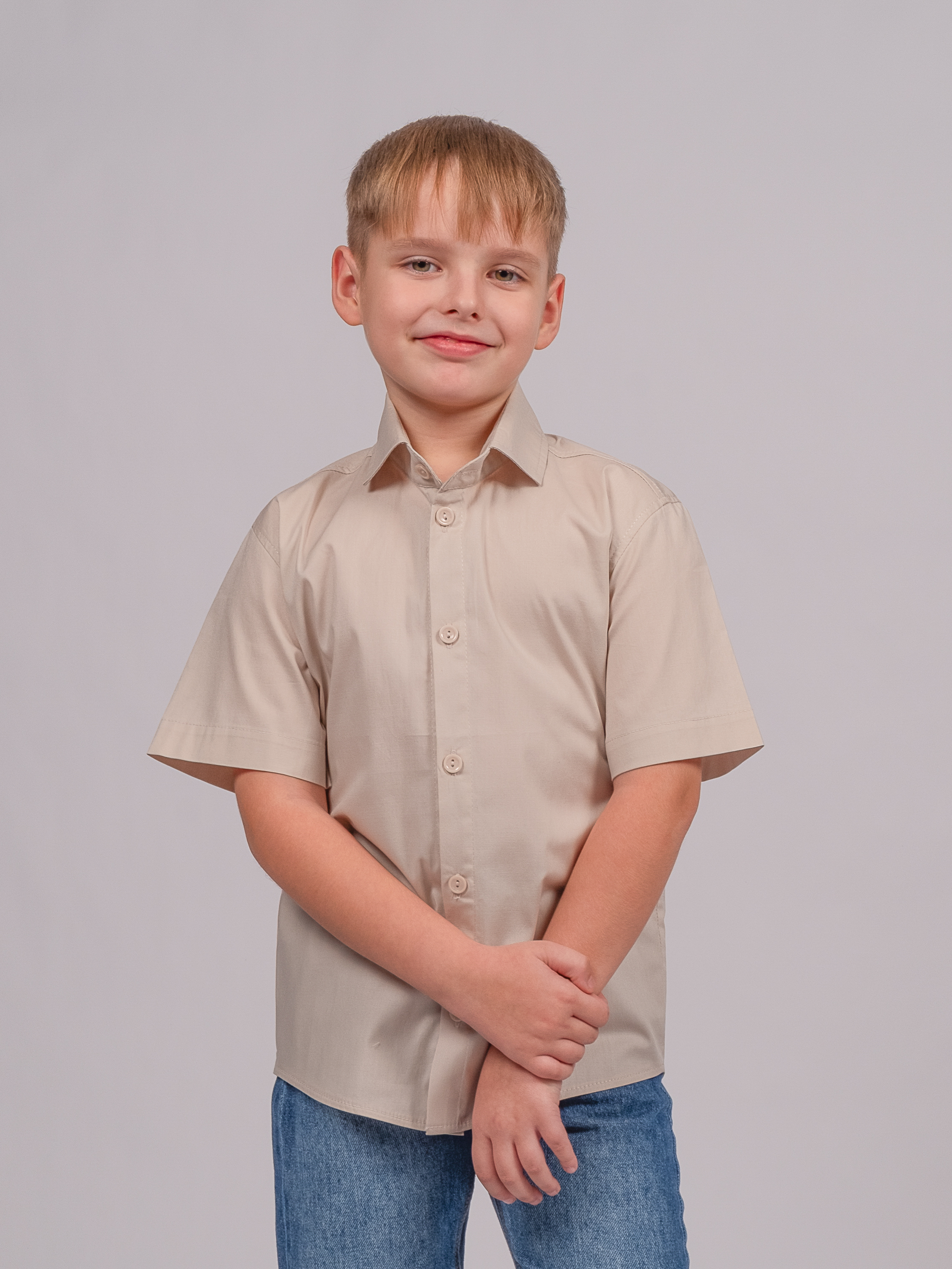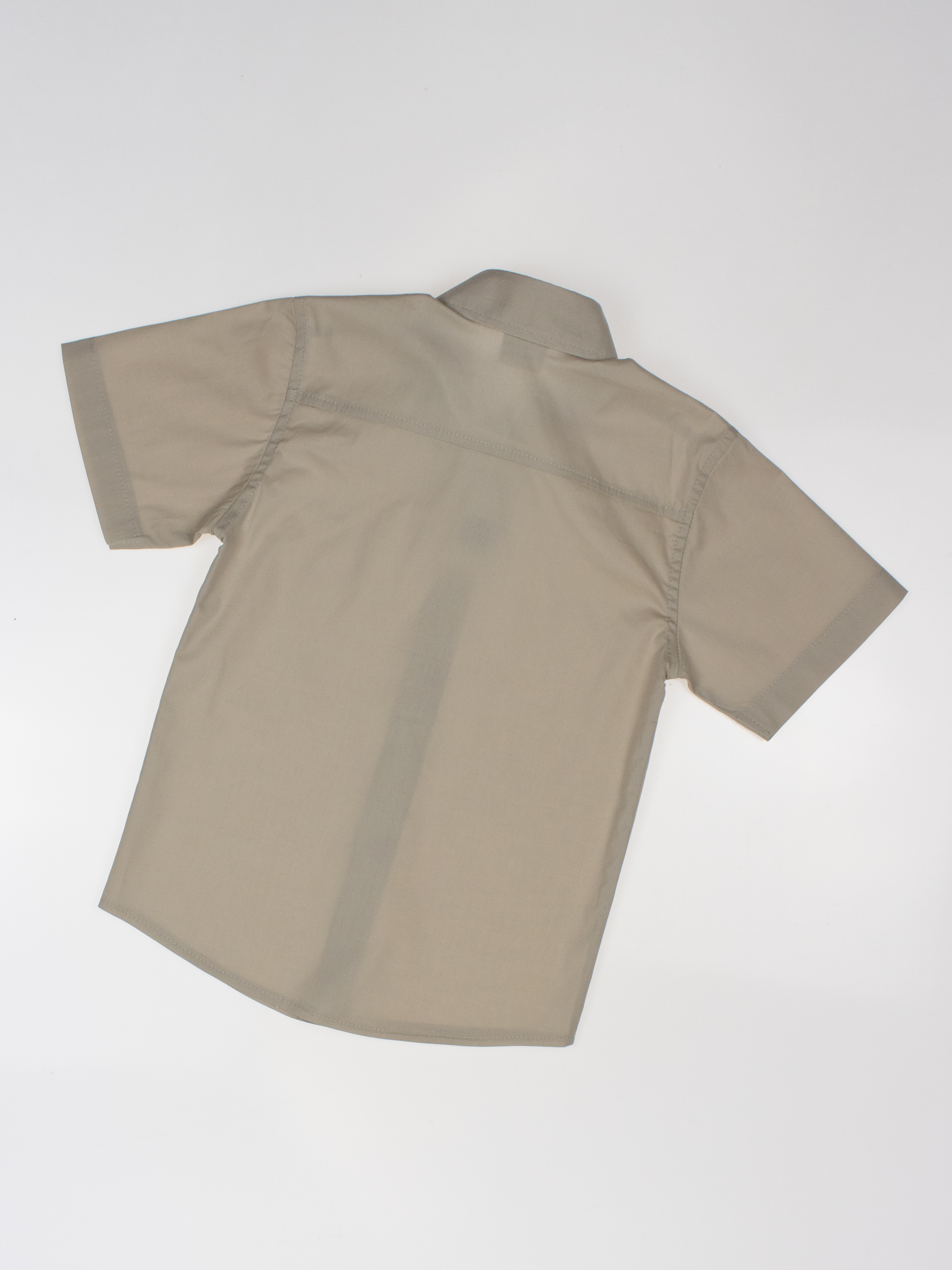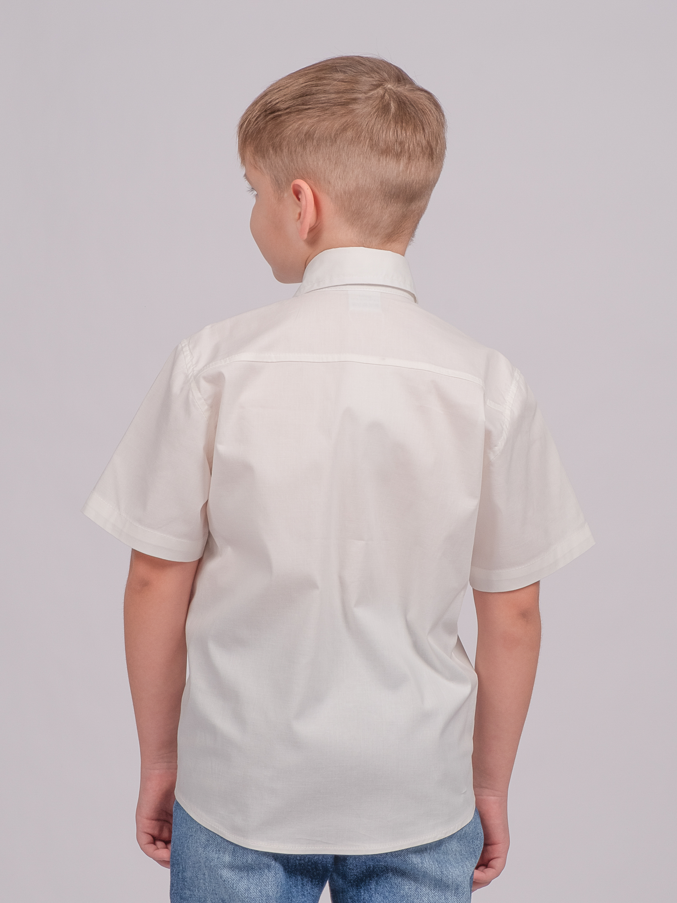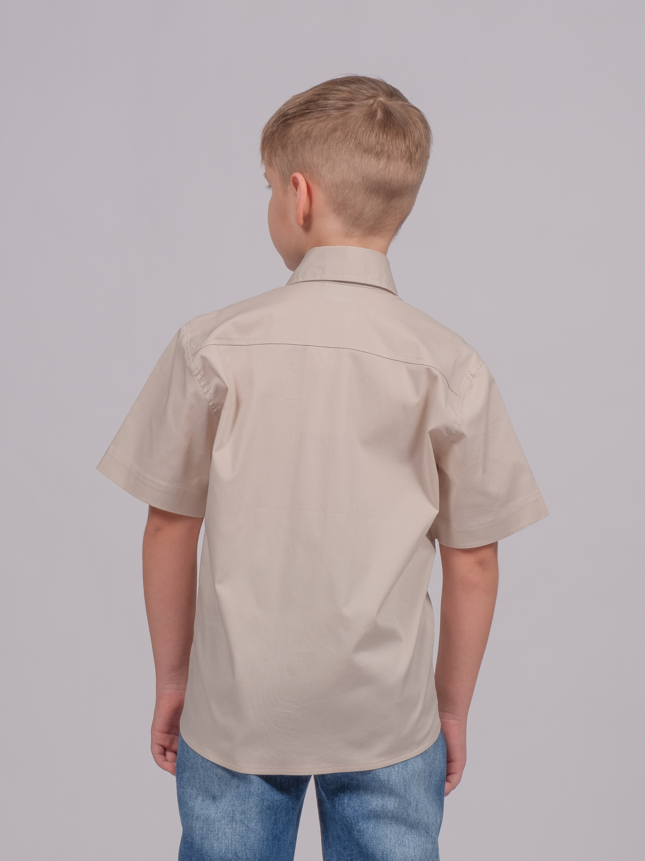Детская однотонная рубашка с коротким рукавом для мальчика оптом. Рубашка изготавлена из смесового материала высокого качества. Модель застегивается на пуговицы.